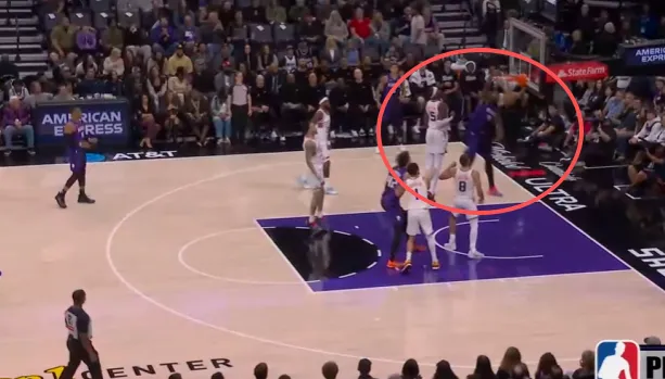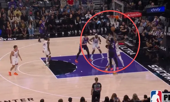 克利福德翻身后仰强投被帽,阿丘瓦拿到地板球后面对前来扑防的布克:先是虚晃,